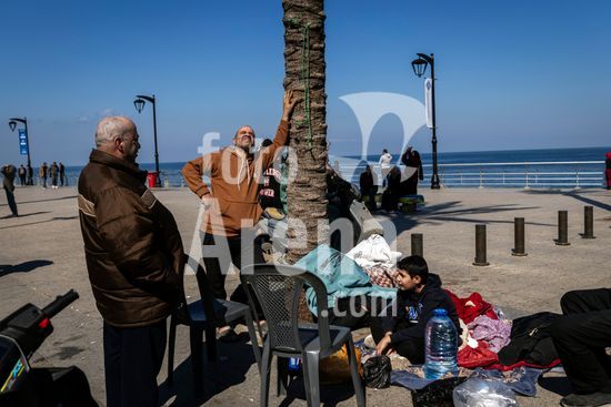 ny020326110011 A man watches the sky over the Corniche, the seaside promenade in Beirut, Lebanon, after he and his family fled their home on Monday, March 2, 2026. Iran-backed Hezbollah militants launched rockets from Lebanon into Israel, prompting Israel to bombard the militiaÕs strongholds outside Beirut. (Diego Ibarra S?nchez/The New York Times/Fotoarena)