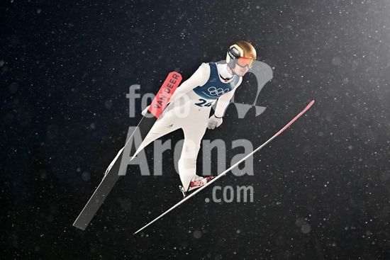 2885217 Predazzo, Italia, 14 de fevereiro de 2026. Johann Andre Forfang, da Noruega, em acao durante a competicao individual de salto de esqui masculino em rampa grande (HS141) dos Jogos Olimpicos de Inverno de 2026 em Predazzo, Italia. (Foto de Igor Kupljenik/Sports Press Photo) (Igor Kupljenik / SPP)
