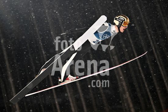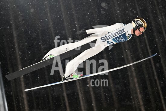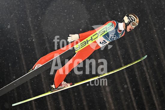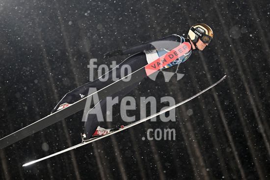 2885258 Predazzo, Italia, 14 de fevereiro de 2026. Stefan Kraft, da Austria, em acao durante a competicao individual de salto de esqui masculino em rampa grande (HS141) dos Jogos Olimpicos de Inverno de 2026 em Predazzo, Italia. (Foto de Igor Kupljenik/Sports Press Photo) (Igor Kupljenik / SPP)