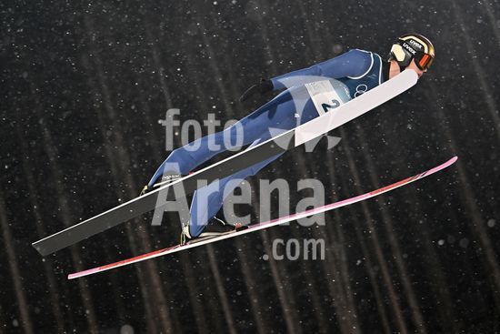 2885213 Predazzo, Italia, 14 de fevereiro de 2026. Kevin Bickner, dos Estados Unidos da America, em acao durante a competicao individual de salto de esqui masculino em rampa grande (HS141) dos Jogos Olimpicos de Inverno de 2026 em Predazzo, Italia. (Foto de Igor Kupljenik/Sports Press Photo) (Igor Kupljenik / SPP)