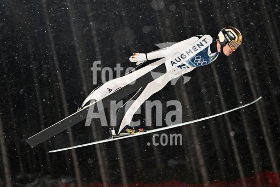 2885247 Predazzo, Italia, 14 de fevereiro de 2026. Andreas Wellinger, da Alemanha, em acao durante a competicao individual de salto de esqui masculino em rampa grande (HS141) dos Jogos Olimpicos de Inverno de 2026 em Predazzo, Italia. (Foto de Igor Kupljenik/Sports Press Photo) (Igor Kupljenik / SPP)