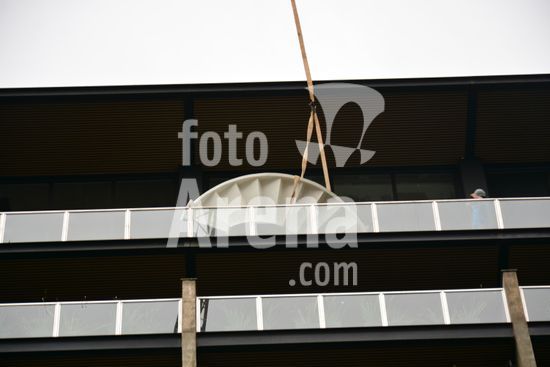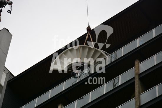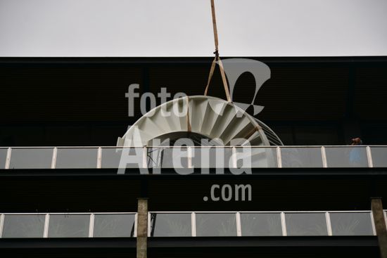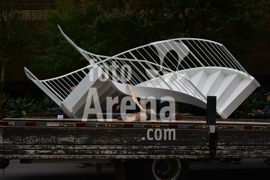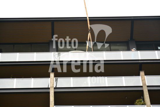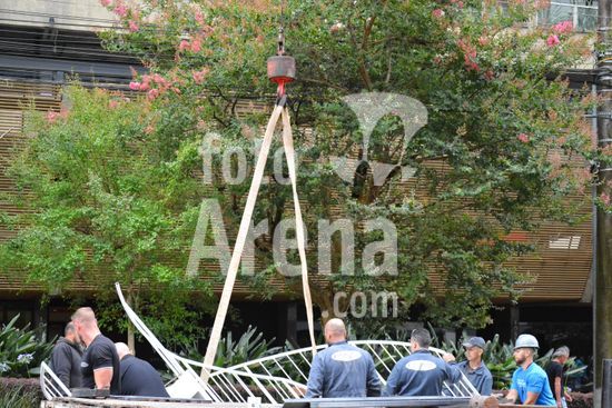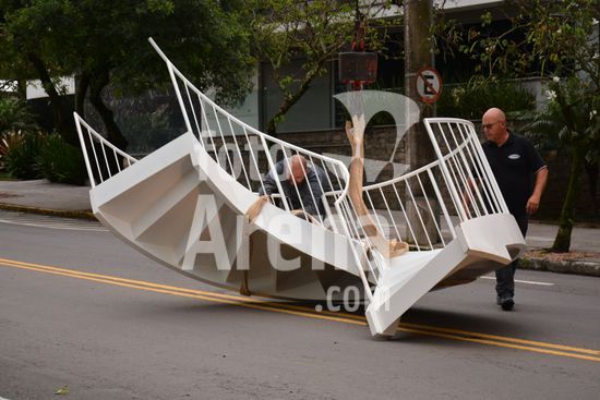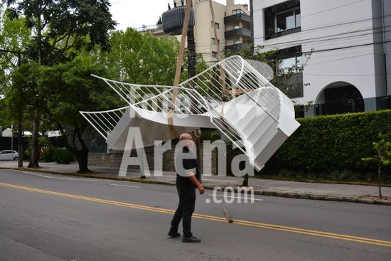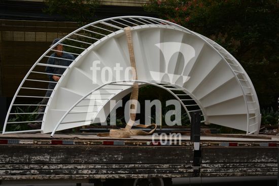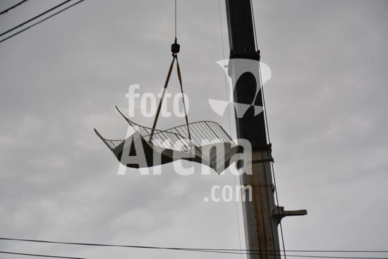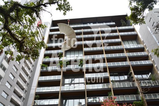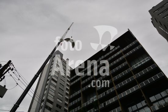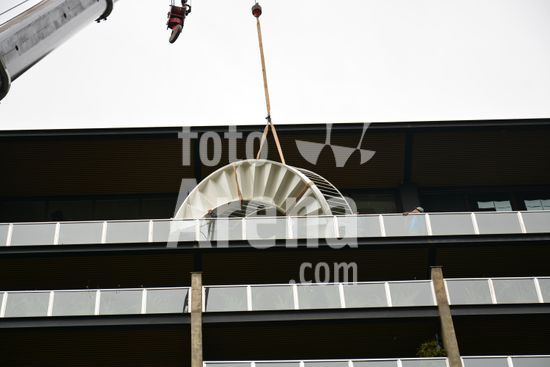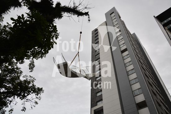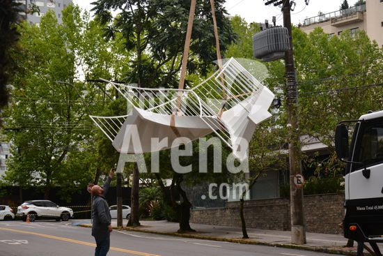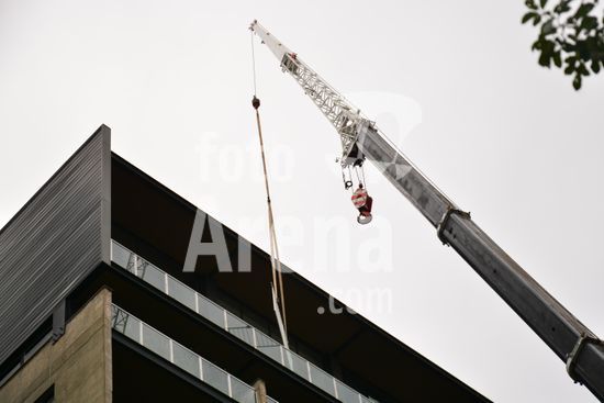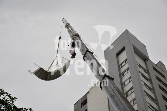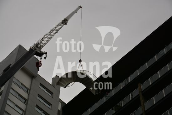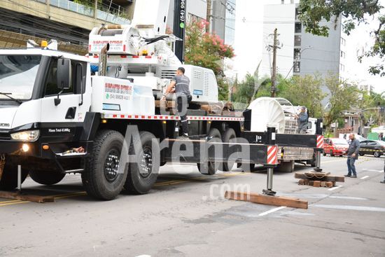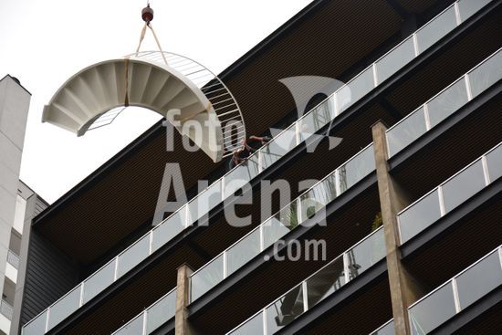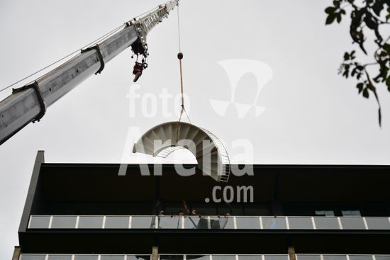 Imagens da operação de içamento de uma escada metálica, na manhã desse sábado, para instalação em uma sala comercial, em um edifício de escritórios, no bairro Exposição, em Caxias do Sul, que necessitou de serviços especializados de engenharia, com a utilização de guinchamento, com lança de longo alcance, interditando, temporariamente, a circulação de veículos e pessoa na área da realização do serviço. Caxias do Sul, RS (10).