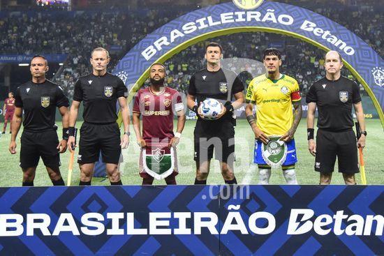 2846841 Equipe de arbitragem e capitães dos times durante partida entre Palmeiras x Fluminense, válida pela trigésima quinta rodada do Campeonato Brasileiro de Futebol 2025, neste sábado (22), no Allianz Parque, SP.