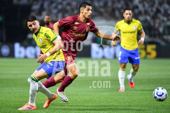 2846753 Kevin Serna do Fluminense (Direita) e Joaquín Piquerez do Palmeiras (Esquerda) disputam a bola, durante partida entre Palmeiras x Fluminense, válida pela trigésima quinta rodada do Campeonato Brasileiro de Futebol 2025, neste sábado (22), no Allianz Parque, SP.