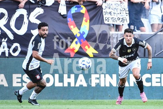2850925 Joaquín Correa do Botafogo (Esquerda) e André Carrillo do Corinthians (Direita) disputam a bola, durante partida entre Corinthians x Botafogo, válida pela trigésima sexta rodada do Campeonato Brasileiro de Futebol 2025, neste domingo (30), na Neo Química Arena, SP.