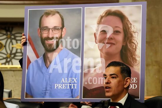 ny030226173413 Rep. Robert Garcia (D-Calif.) speaks at a public forum in Washington held by Congressional Democrats on Tuesday, Feb. 3, 2026. Behind him are photos of Alex Pretti and Renee Good, who were fatally shot by federal immigration agents in Minneapolis. (Tierney L. Cross/The New York Times/Fotoarena)