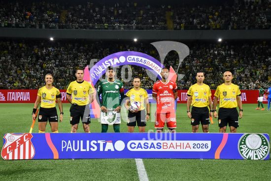 2892681 Equipe de arbitragem e capitães dos times durante partida entre Palmeiras x Capivariano, válida pelas quartas de final do Campeonato Paulista de Futebol 2026, neste sábado (21), na Arena Crefisa Barueri, em Barueri, SP.