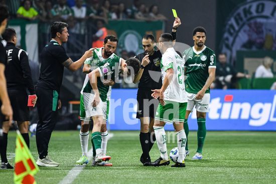 2822103 Davi de Oliveira Lacerda aplica cartão amarelo em Rodrigo Sam durante partida entre Palmeiras e Juventude válida pela 12ª rodada do Campeonato Brasileiro 2025 realizada no Allianz Parque na noite deste sábado (11).
