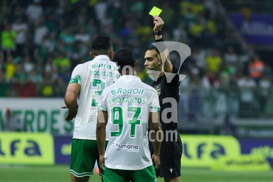2822041 O árbitro Davi De Oliveira Lacerda dá cartão amarelo durante partida entre Palmeiras x Juventude, válida pela décima segunda rodada do Campeonato Brasileiro de Futebol 2025 (partida atrasada), neste sábado (11), no Allianz Parque, SP.