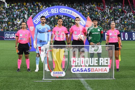 2873318 Equipe de arbitragem e capitães dos times durante partida entre Palmeiras x São Paulo FC, válida pela quinta rodada do Campeonato Paulista de Futebol 2026, neste sábado (24), na Arena Crefisa Barueri, em Barueri, SP.