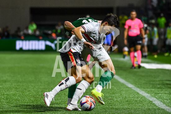 2873355 Andreas Pereira do Palmeiras e dD. Bobadilla do São Paulo disputam a bola urante partida entre Palmeiras x São Paulo FC, válida pela quinta rodada do Campeonato Paulista de Futebol 2026, neste sábado (24), na Arena Crefisa Barueri, em Barueri, SP.