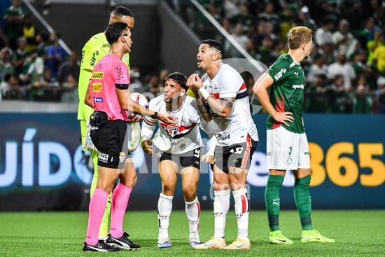 2873360 Calleri e Luciano do São Paulo reclamando com o árbitro Matheus Delgado Candançan durante partida entre Palmeiras x São Paulo FC, válida pela quinta rodada do Campeonato Paulista de Futebol 2026, neste sábado (24), na Arena Crefisa Barueri, em Barueri, SP.
