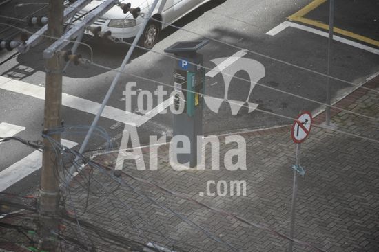 2912103 Vista de Parquímetros , dispositivos eletrônicos ou mecânicos usados para gerenciar o estacionamento rotativo (Zona Azul) em vias públicas, permitindo o pagamento por tempo de permanência através de moedas, cartões (crédito/débito), aplicativos ou cartões pré-pagos