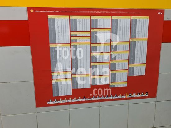 2859805 Tabela de lubrificação para carros de diversas marcas, em oficina na cidade de Fortaleza, capital cearense.