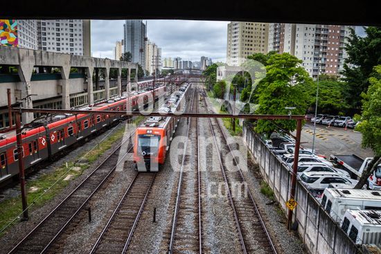 Vista de cima da passagem dos trens das linhas 11-Coral e 12-Safira da CPTM (Companhia Paulista de Trens Metropolitanos) pela estação Bresser-Mooca, na Zona Leste de São Paulo (SP). A imagem captura o intenso fluxo do transporte sobre trilhos que é vital para a mobilidade de milhões de pessoas que se deslocam diariamente entre os bairros periféricos e a região central da metrópole. Emoldurada pela paisagem urbana, com seus prédios residenciais, viadutos e áreas verdes, a cena ferroviária evidencia a complexa infraestrutura que sustenta o funcionamento da maior cidade do Brasil, sendo um registro importante para a compreensão dos desafios do planejamento urbano e da dinâmica social paulistana.