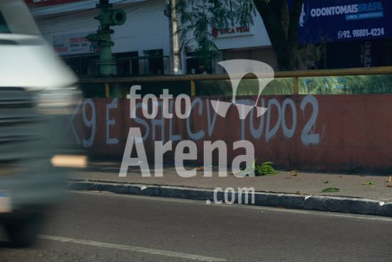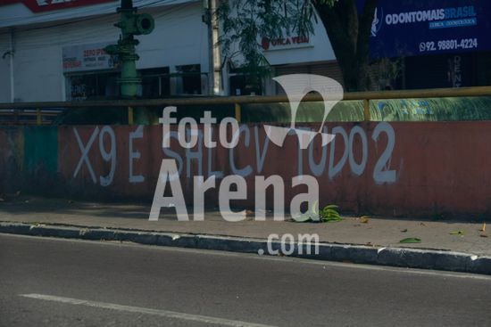 2834275 Pichações do "CV" (sigla da facção do Comando Vermelho), em paredões no bairro da Compensa, zona oeste, e em prédios históricos no centro de Manaus (AM), na manhã deste domingo (2).
