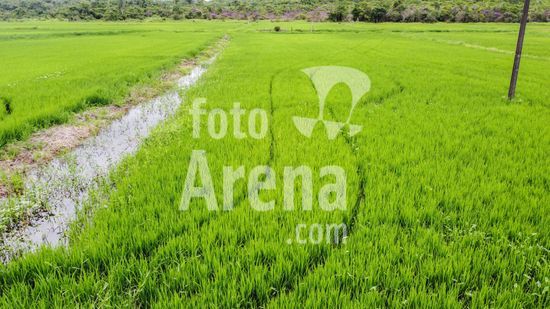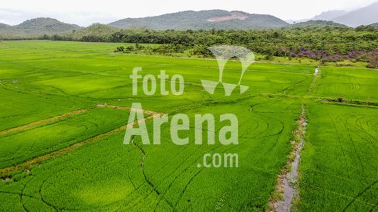 2876858 Plantação de arroz em propriedade rural em Garuva, na Região Nordeste de Santa Catarina. Imagem capturada por drone. Informações das coordenadas: 26° 1' 58,89" S, 48° 46' 38,26" W. Latitude 26,1.9815S. Longitude 48,46.6376W