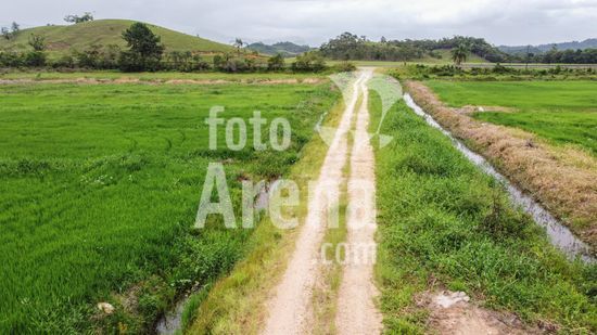 2876856 Plantação de arroz em propriedade rural em Garuva, na Região Nordeste de Santa Catarina. Imagem capturada por drone. Informações das coordenadas: 26° 1' 59,46" S, 48° 46' 38,59" W. Latitude 26,1.991S. Longitude 48,46.6431W