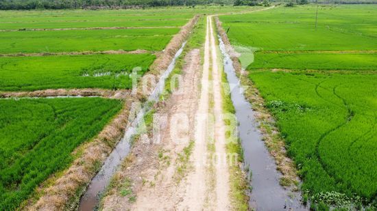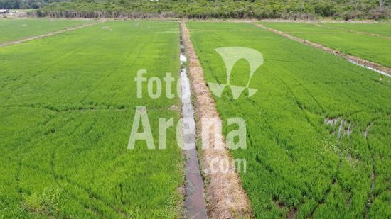 2876842 Plantação de arroz em propriedade rural em Garuva, na Região Nordeste de Santa Catarina. Imagem capturada por drone. Informações das coordenadas: 26° 1' 59,83" S, 48° 46' 38,48" W. Latitude 26,1.9972S. Longitude 48,46.6414W