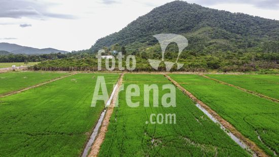 2876857 Plantação de arroz em propriedade rural em Garuva, na Região Nordeste de Santa Catarina. Imagem capturada por drone. Informações das coordenadas: 26° 1' 58,96" S, 48° 46' 38,25" W. Latitude 26,1.9826S. Longitude 48,46.6375W