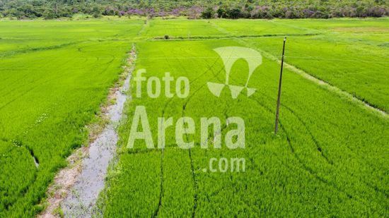 2876846 Plantação de arroz em propriedade rural em Garuva, na Região Nordeste de Santa Catarina. Imagem capturada por drone. Informações das coordenadas: 26° 1' 58,97" S, 48° 46' 38,25" W. Latitude 26,1.9828S. Longitude 48,46.6375W
