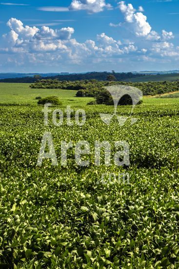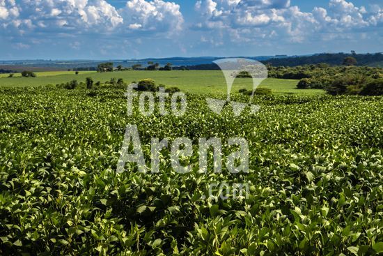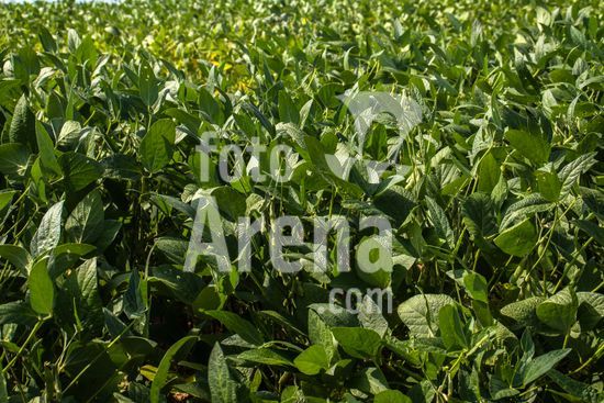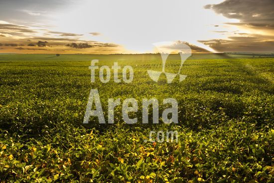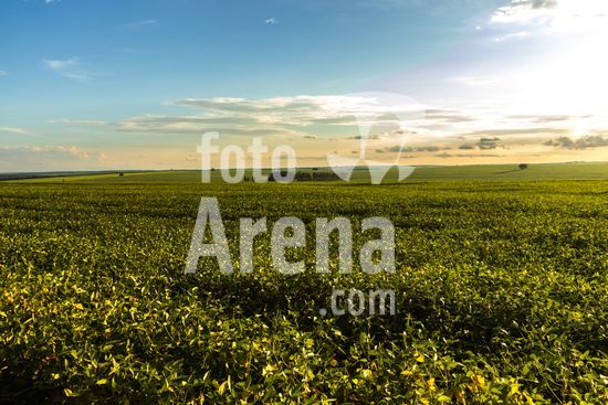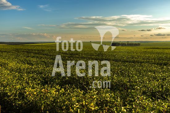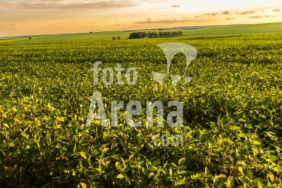Vista panorâmica de uma plantação de soja transgênica (Glycine max) em estágio de crescimento vegetativo, fotografada ao entardecer em na zona rural de Marília, SP. A tonalidade dourada da luz solar realça o verde intenso das folhas trifolioladas características da leguminosa. Ao fundo, a paisagem plana e o horizonte amplo revelam a extensão das monoculturas que marcam a agricultura moderna brasileira. A soja é hoje a principal commodity agrícola do Brasil, sendo o país o maior exportador mundial do grão. Seu cultivo está fortemente associado ao avanço do agronegócio no Cerrado e na Amazônia Legal, sendo tema central em debates sobre produção de alimentos, uso do solo, sustentabilidade e economia rural