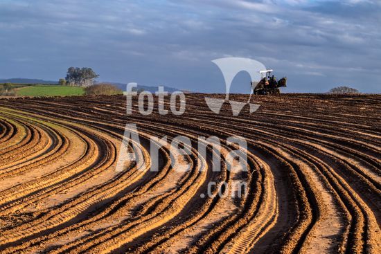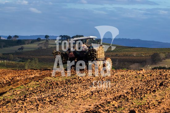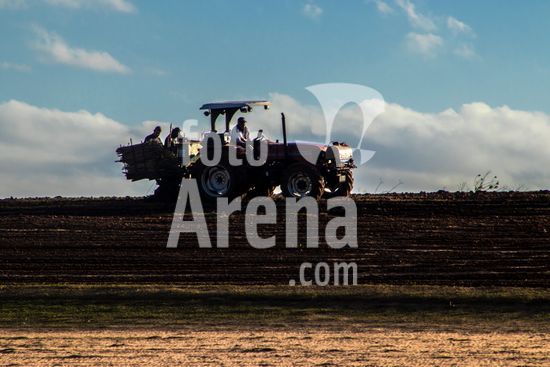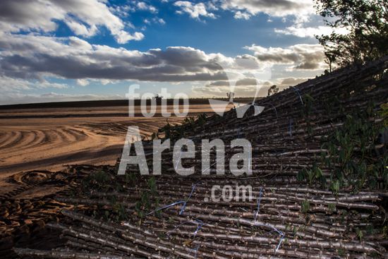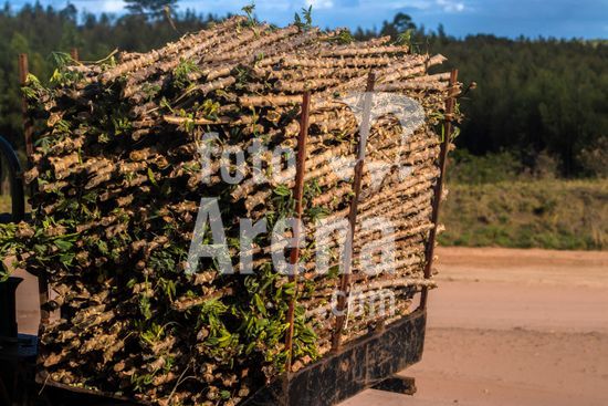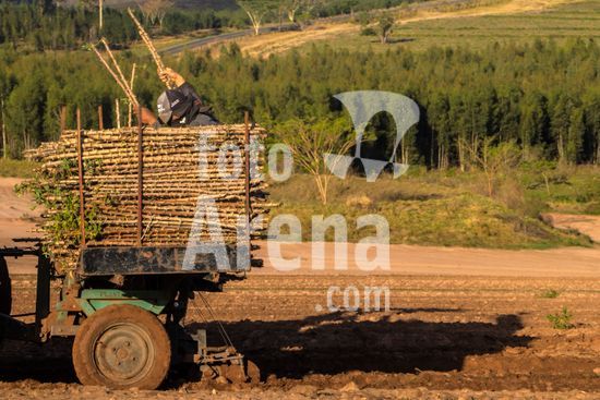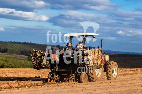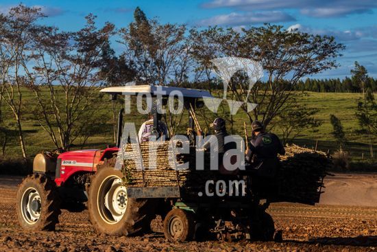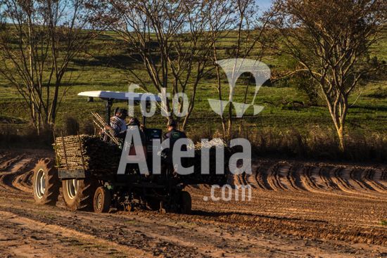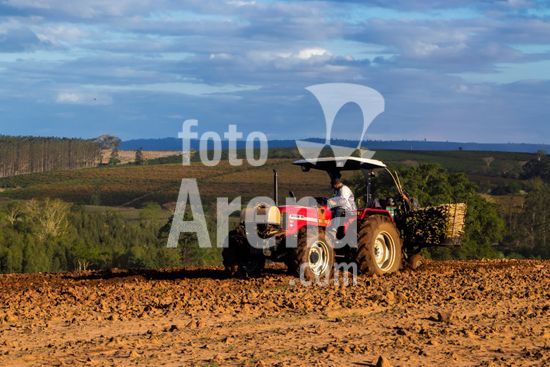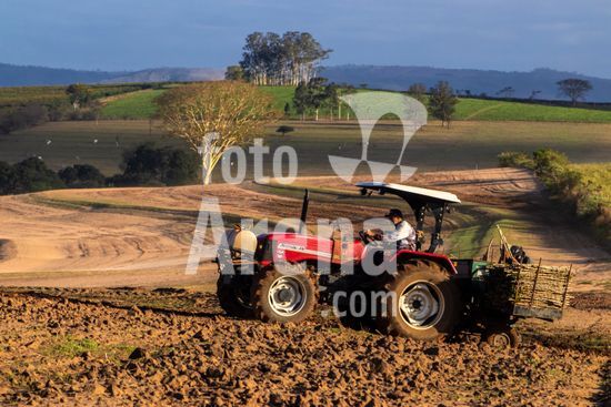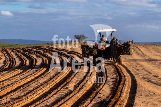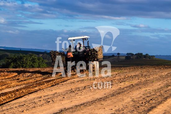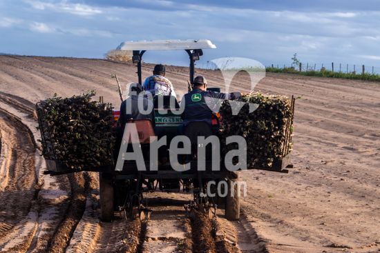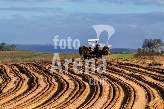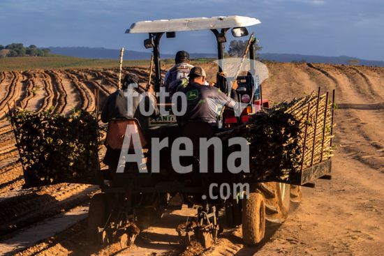 Trabalhadores rurais realizam o plantio de mandioca (Manihot esculenta) no distrito de Avencas, em Marília, interior de São Paulo. A Esta é uma etapa fundamental do agronegócio brasileiro, combinando o uso de tecnologia, com um trator e uma plantadeira, e a mão de obra humana. Os agricultores, posicionados na parte traseira do veículo, abastecem a máquina com as manivas-semente (pedaços do caule da mandioca) que darão origem a novas plantas. A mandioca, também conhecida como aipim ou macaxeira, é uma das bases da alimentação no Brasil e sua cultura é de grande importância econômica e social para o país.