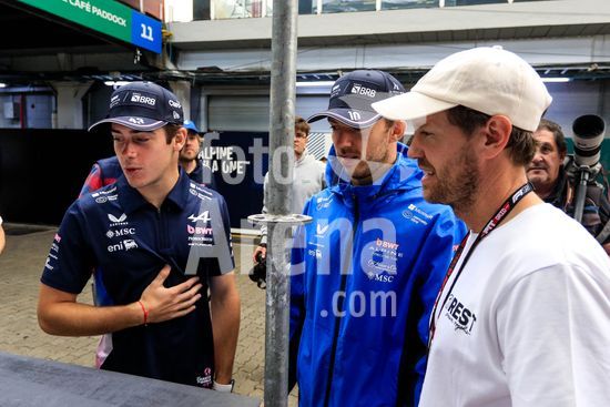 2836755 Quinta-feira (06) de preparativos para o Grande Prêmio de Fórmula 1 em São Paulo, que acontecerá neste final de semana no autódromo de Interlagos, zona sul da capital paulista. Na foto os pilotos da BWT Alpine F1 Team, Franco Colapinto (20), Pierre Gasly (10) e o ex-piloto, Sebastian Vettel.