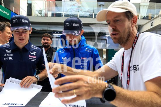 2836756 Quinta-feira (06) de preparativos para o Grande Prêmio de Fórmula 1 em São Paulo, que acontecerá neste final de semana no autódromo de Interlagos, zona sul da capital paulista. Na foto os pilotos da BWT Alpine F1 Team, Franco Colapinto (20), Pierre Gasly (10) e o ex-piloto, Sebastian Vettel.