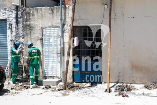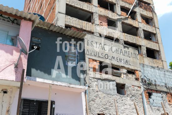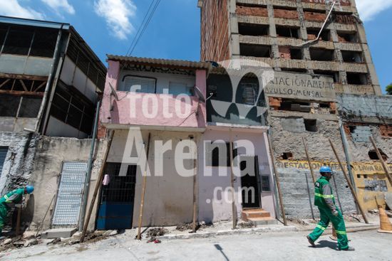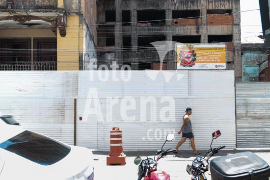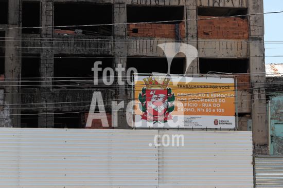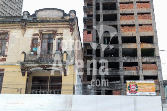 Residência ao lado do Edifício Caveirão com acesso bloqueado por tapumes no final da manhã desta Terça (27) durante o processo de demolição do Edifício Caveirão, localizado na Rua do Carmo, centro histórico de São Paulo, SP. O edifício nunca foi terminado e está abandonado há mais de 60 anos. O processo de demolição foi autorizado em Agosto de 2025 com encerramento previsto para Junho de 2026 e será feito de forma inteiramente manual para preservar os imóveis do entorno, com os custos a serem reembolsados pelo atual proprietário do imóvel.
