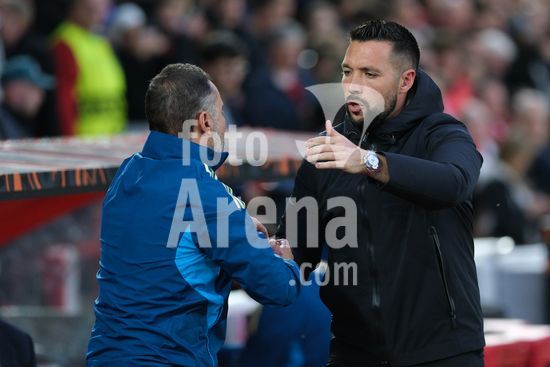 2926237 NOTTINGHAM, INGLATERRA - 16 DE ABRIL: O tecnico do Nottingham Forest, Vitor Pereira, e o tecnico do FC Porto, Francesco Farioli, antes do pontape inicial da partida das quartas de final da Liga Europa da UEFA entre Nottingham Forest e FC Porto, no City Ground, em 16 de abril de 2026, em Nottingham, Inglaterra. (Paul Bonser / Sports Press Photo / SPP)