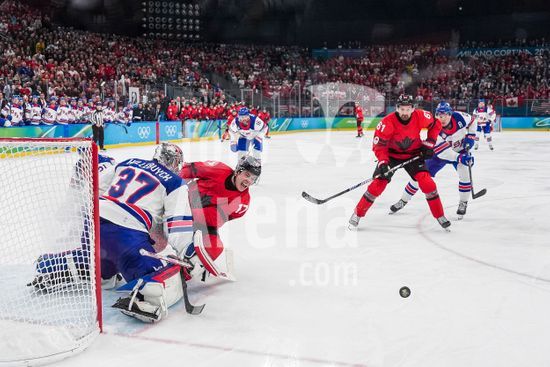 ny220226150811 Connor Hellebuyck #37 of the United States makes a save against Macklin Celebrini #17 of Canada during the men's gold medal hockey game at the 2026 Milan Cortina Winter Olympics in Milan, Italy, on Sunday, Feb. 22, 2026. (Jeremy White/The New York Times/Fotoarena)
