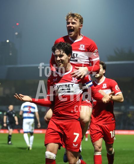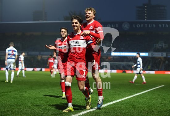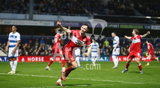 2901550 LONDRES, INGLATERRA, 8 DE MARCO: GOLO 3-0, Hayden Hackney, do Middlesbrough, comemora apos marcar o gol que colocou o Middlesbrough em vantagem de 3-0 durante a partida entre Queens Park Rangers FC e Middlesbrough FC, valida pelo Sky Bet Championship, no Estadio Loftus Road, em Londres, Inglaterra, em 8 de marco. (Foto de Daniel Weir) (Daniel Weir/Sports Press Photo / SPP)