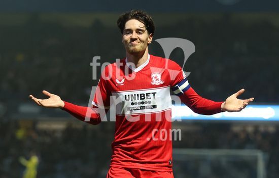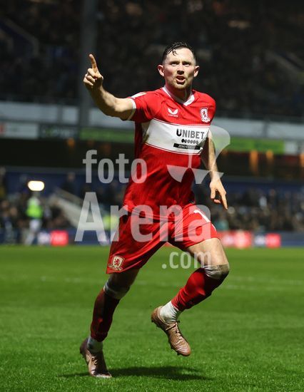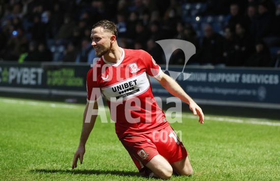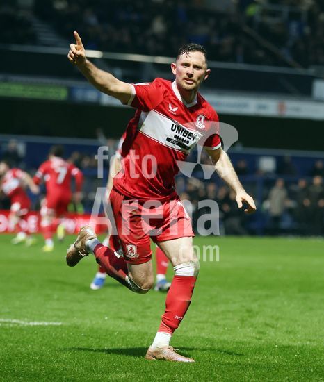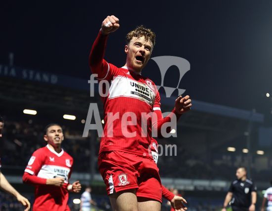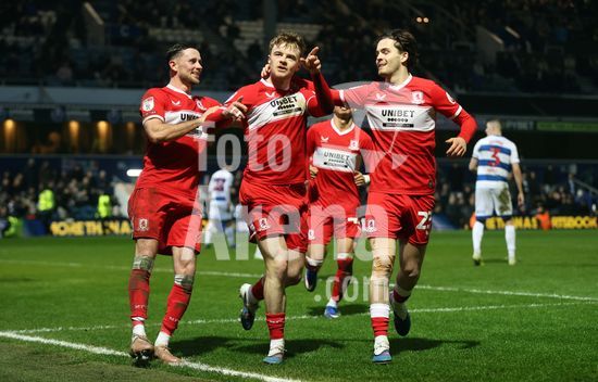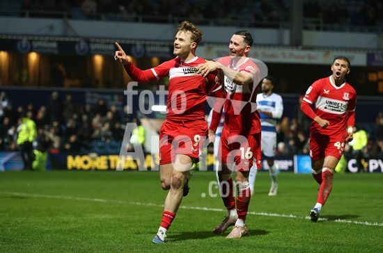 2901563 LONDRES, INGLATERRA, 8 DE MARCO: GOL 4-0, Tommy Conway, do Middlesbrough, comemora apos marcar um gol de penalti, colocando o Middlesbrough em vantagem de 4-0 durante a partida entre Queens Park Rangers FC e Middlesbrough FC, valida pelo Sky Bet Championship, no Estadio Loftus Road, em Londres, Inglaterra, em 8 de marco. (Foto de Daniel Weir) (Daniel Weir/Sports Press Photo / SPP)