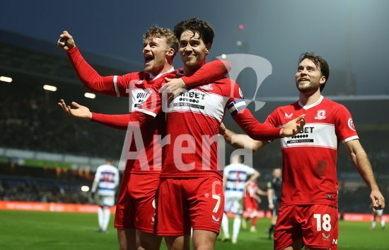 2901578 LONDRES, INGLATERRA, 8 DE MARCO: GOL 4-0, Tommy Conway, do Middlesbrough, comemora com Alan Browne e Leo Castledine, tambem do Middlesbrough, apos marcar um gol de penalti que colocou o Middlesbrough em vantagem de 4-0 durante a partida entre Queens Park Rangers FC e Middlesbrough FC, valida pelo Sky Bet Championship, no Estadio Loftus Road, em Londres, Inglaterra, em 8 de marco. (Foto de Daniel Weir) (Daniel Weir/Sports Press Photo / SPP)