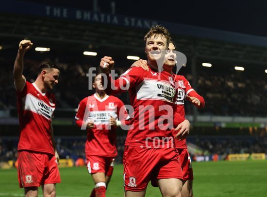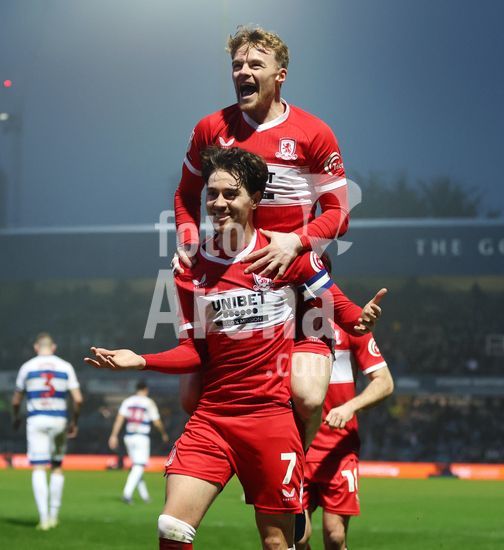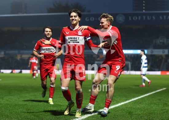 2901548 LONDRES, INGLATERRA, 8 DE MARCO: GOLO 3-0, Hayden Hackney, do Middlesbrough, comemora com Tommy Conway, tambem do Middlesbrough, apos marcar o gol que colocou o Middlesbrough em vantagem de 3-0 durante a partida entre Queens Park Rangers FC e Middlesbrough FC, valida pelo Sky Bet Championship, no Estadio Loftus Road, em Londres, Inglaterra, em 8 de marco. (Foto de Daniel Weir) (Daniel Weir/Sports Press Photo / SPP)