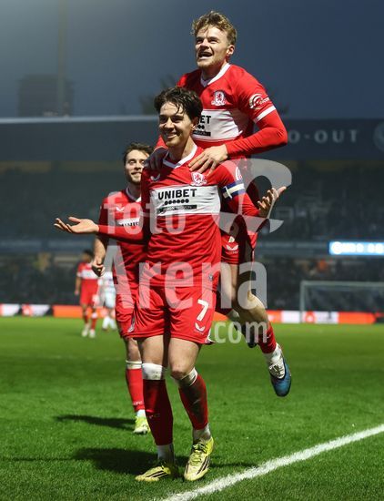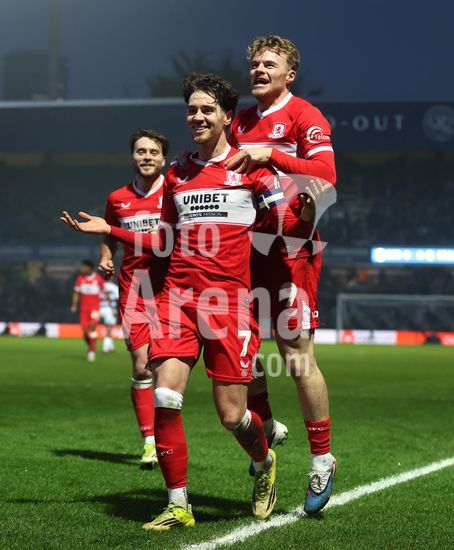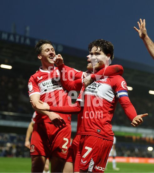 2901545 LONDRES, INGLATERRA, 8 DE MARCO: GOLO 3-0, Hayden Hackney, do Middlesbrough, comemora com Tommy Conway, tambem do Middlesbrough, apos marcar o gol que colocou o Middlesbrough em vantagem de 3-0 durante a partida entre Queens Park Rangers FC e Middlesbrough FC, valida pelo Sky Bet Championship, no Estadio Loftus Road, em Londres, Inglaterra, em 8 de marco. (Foto de Daniel Weir) (Daniel Weir/Sports Press Photo / SPP)