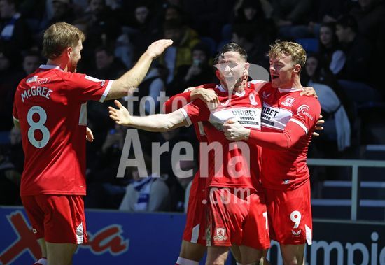 2901572 LONDRES, INGLATERRA, 8 DE MARCO: GOL 4-0, Tommy Conway, do Middlesbrough, comemora com Alan Browne, tambem do Middlesbrough, apos marcar um gol de penalti que colocou o Middlesbrough em vantagem de 4-0 durante a partida entre Queens Park Rangers FC e Middlesbrough FC, valida pelo Campeonato Sky Bet, no Estadio Loftus Road, em Londres, Inglaterra, em 8 de marco. (Foto de Daniel Weir) (Daniel Weir/Sports Press Photo / SPP)