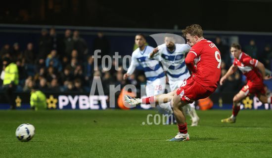 2901558 LONDRES, INGLATERRA, 8 DE MARCO: GOL 4-0, Tommy Conway, do Middlesbrough, marca um gol de penalti, colocando o Middlesbrough em vantagem de 4-0 durante a partida entre Queens Park Rangers FC e Middlesbrough FC, valida pelo Sky Bet Championship, no Estadio Loftus Road, em Londres, Inglaterra, em 8 de marco. (Foto de Daniel Weir) (Daniel Weir/Sports Press Photo / SPP)