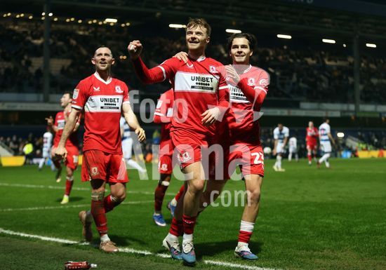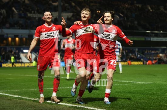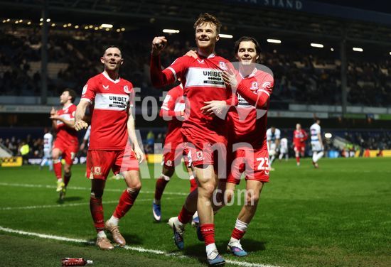 2901564 LONDRES, INGLATERRA, 8 DE MARCO: GOL 4-0, Tommy Conway, do Middlesbrough, comemora apos marcar um gol de penalti, colocando o Middlesbrough em vantagem de 4-0 durante a partida entre Queens Park Rangers FC e Middlesbrough FC, valida pelo Sky Bet Championship, no Estadio Loftus Road, em Londres, Inglaterra, em 8 de marco. (Foto de Daniel Weir) (Daniel Weir/Sports Press Photo / SPP)