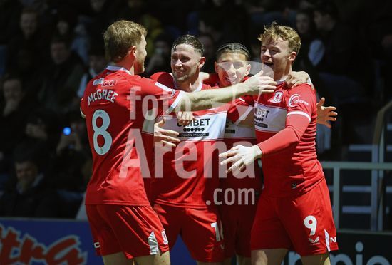 2901573 LONDRES, INGLATERRA, 8 DE MARCO: GOL 4-0, Tommy Conway, do Middlesbrough, comemora com Alan Browne e Leo Castledine, tambem do Middlesbrough, apos marcar um gol de penalti que colocou o Middlesbrough em vantagem de 4-0 durante a partida entre Queens Park Rangers FC e Middlesbrough FC, valida pelo Sky Bet Championship, no Estadio Loftus Road, em Londres, Inglaterra, em 8 de marco. (Foto de Daniel Weir) (Daniel Weir/Sports Press Photo / SPP)