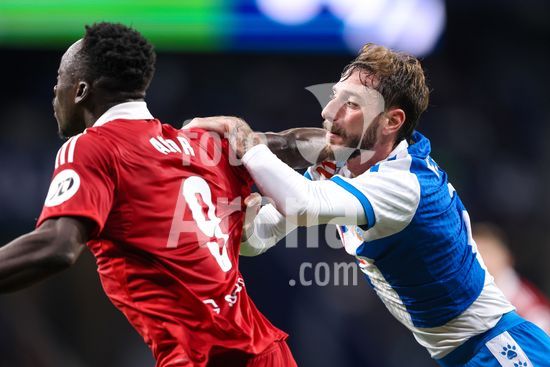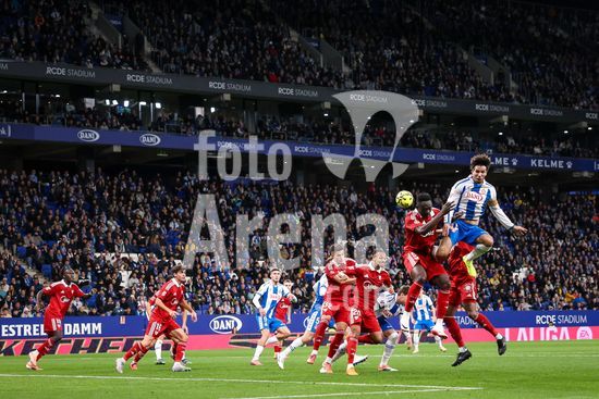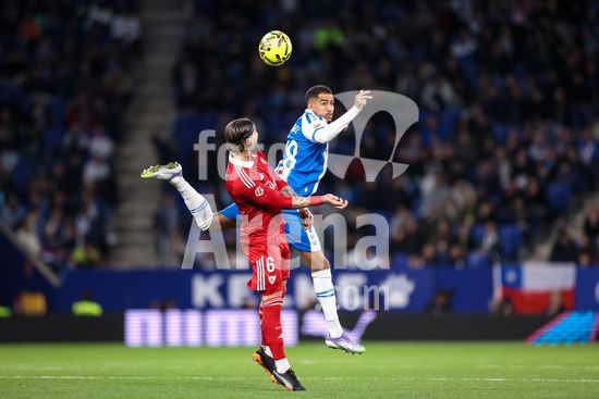 2847744 Roberto Fernández e Akor Adams disputam bola aérea durante RCD Espanyol vs Sevilla realizada no RCDE Stadium em Barcelona, CA.
