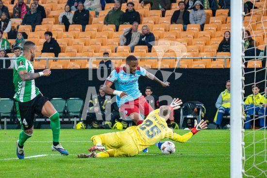 2876178 Cyle Larin (N10), substituto do Feyenoord Rotterdam, e parado por Pau Lopez (N25) durante a partida da Liga Europa da UEFA 25/26 entre Real Betis e Feyenoord no Estadio La Cartuja em Sevilha, Espanha. (Andres Lopez Sheridan / SPP)