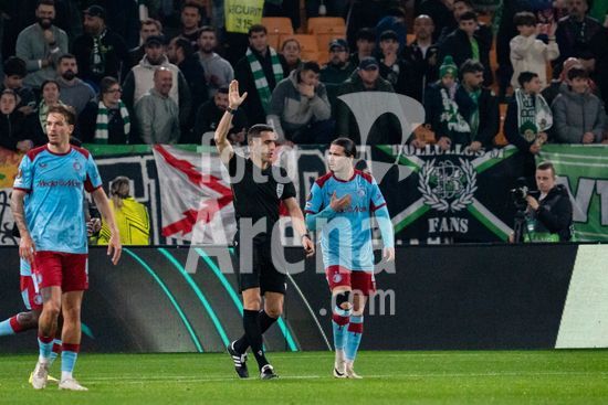 2876207 O arbitro Nicola Dabanovic conversa com Anis Hadj Moussa (N23) apos anular um gol do Feyenoord Rotterdam por impedimento durante a partida da Liga Europa da UEFA 25/26 entre Real Betis e Feyenoord no Estadio La Cartuja em Sevilha, Espanha. (Andres Lopez Sheridan / SPP)