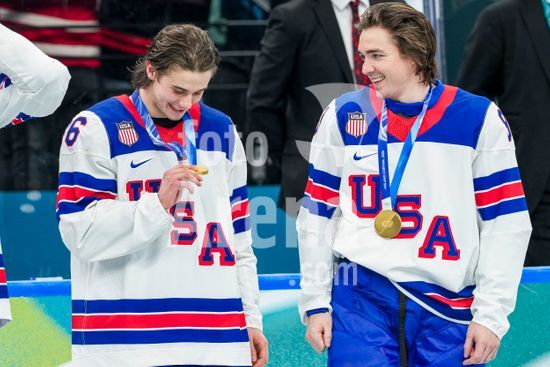 ny220226134511 Quinn Hughes #43 and Jack Hughes #86 of the United States celebrate after beating Canada in overtime in the men's gold medal hockey game during the 2026 Milan Cortina Winter Olympics in Milan, Italy, on Sunday, Feb. 22, 2026. (Doug Mills/The New York Times/Fotoarena)
