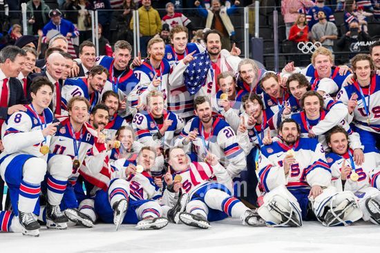 ny220226134411 Team United States players celebrate after beating Canada in overtime in the men's gold medal hockey game during the 2026 Milan Cortina Winter Olympics in Milan, Italy, on Sunday, Feb. 22, 2026. (Doug Mills/The New York Times/Fotoarena)
