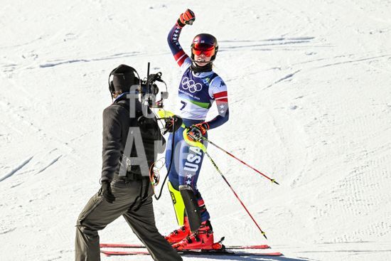ny180226112411 Mikaela Shiffrin, of the United States, celebrates after the second run of the women's slalom competition at the 2026 Milan Cortina Winter Olympics in Cortina d'Ampezzo, Italy, Feb. 18, 2026. (James Hill/The New York Times/Fotoarena)