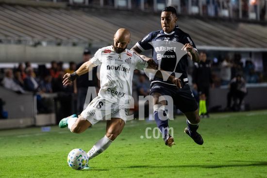 2917612 Thaciano (Santos) e Alef Manga (Remo) durante a partida entre Santos e Remo, válida pela 9ª rodada do Brasileirão, realizada na noite desta quinta-feira (02) no Estádio Urbano Caldeira, a Vila Belmiro, em Santos, SP.