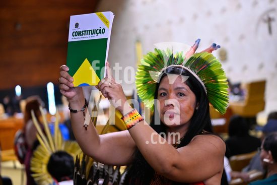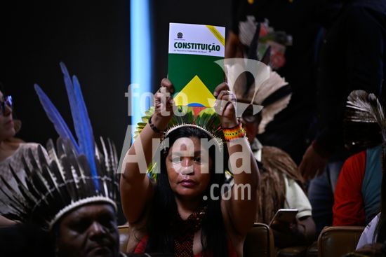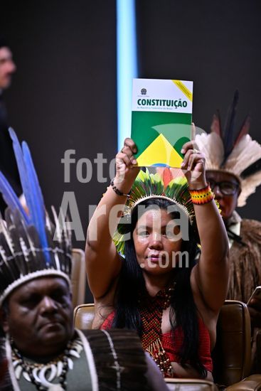 2857139 Foto, Indígena segurando a constituição. Nesta quarta (10) o Supremo Tribunal Federal (STF) realiza o julgamento das ações que questionam lei do marco temporal das terras indígenas.