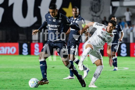 2917587 Marcelinho (Remo) e Alvaro Barreal (Santos) durante a partida entre Santos e Remo, válida pela 9ª rodada do Brasileirão, realizada na noite desta quinta-feira (02) no Estádio Urbano Caldeira, a Vila Belmiro, em Santos, SP.